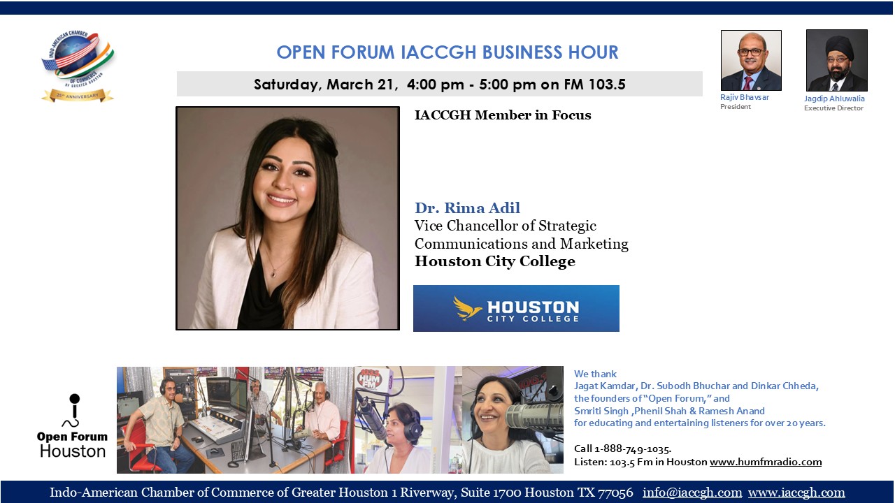 Open Forum IACCGH Business Hour Featuring IACCGH Member in Focus: Dr. Rima Adil, Houston City College