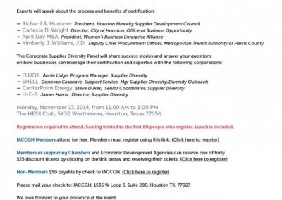 HOUSTON: Four major certification agencies and four high level Fortune 500 Supplier Diversity Managers shared a wealth of information about the advantages of certification and the Procurement process with IACCGH members and guests on November 17 at the HESS Club.