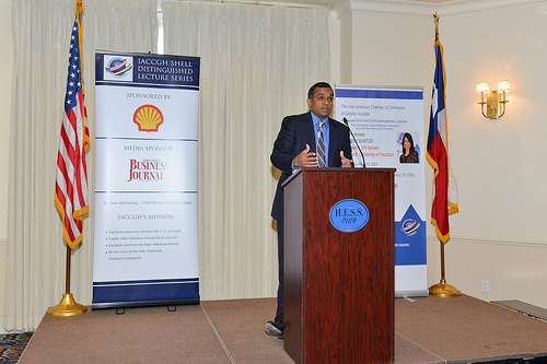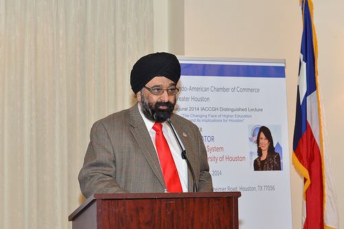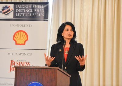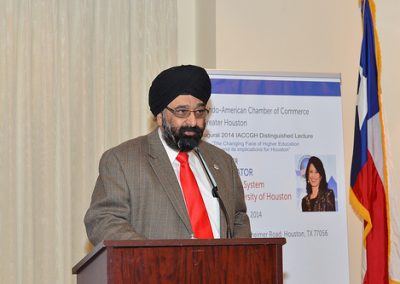 The first guest in the series of Distinguished Lectures organized by IACCGH and sponsored by Shell, Dr. Khator is best known as “the Chancellor who made UH a Tier 1 university”. She’s pretty, charming and as IACCGH President Ramabhadran put it “a rock star on the campus and beyond”. It was no surprise that the event held on March 5th was filled to capacity. Executive Director of IACCGH, Jagdip Ahluwalia welcomed the gathering and recognized the luminaries of the afternoon – Consul General P. Harish, Founding President Durga Agarwal, members Gopal Savjani, Juuhi Ahuja and Dr. Stephen Klineberg. He also welcomed the media calling it the “force multiplier” and outlined the objectives of IACCGH – primary among them the networking opportunities it affords for entrepreneurs, professionals and businessmen. President Sanjay Ramabhadran recognized the growing trade between the Greater Houston region and India as well as the Chamber being the voice of the Indo American business community. Apart from several initiatives to encourage networking, he outlined IACCGH’s latest effort – a Power Breakfast Dialogue where a business leader would talk to a small group of people to facilitate better interaction within business sectors. The focus of the lecture on education, he highlighted, was recognition of the fact that Houston’s future is inextricably linked to the ability of the education system – early childhood to university education, to touch everyone in this diverse city. Dubbing Dr. Renu Khator as “Houston’s Global Ambassador”, he introduced her to the audience and invited her to address the gathering.