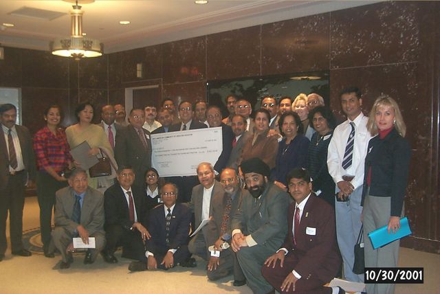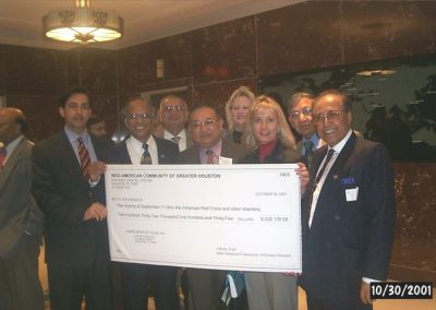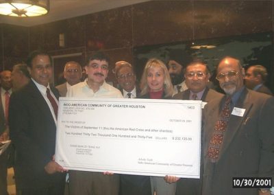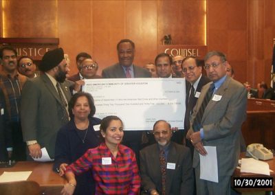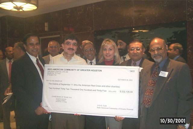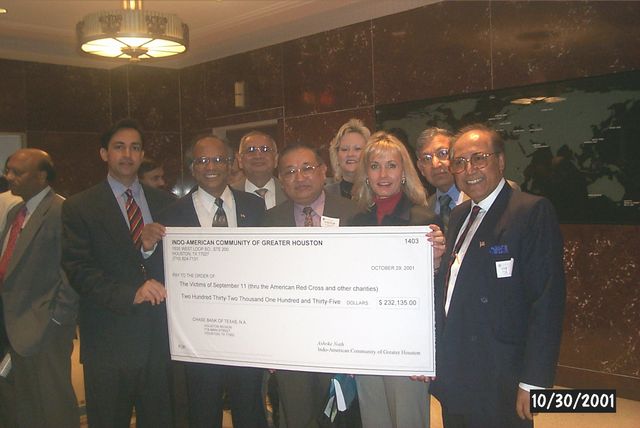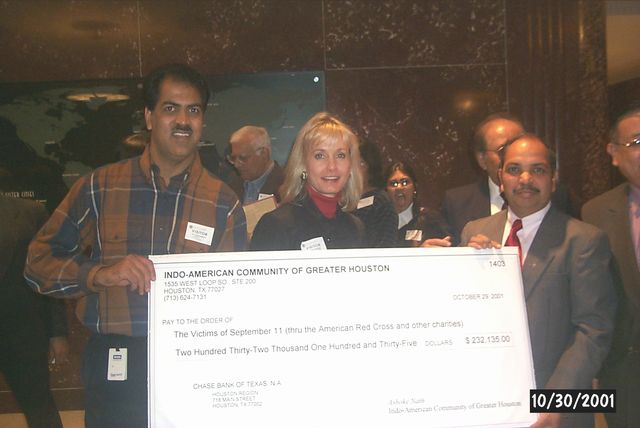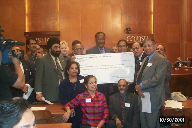 October 30th, 2001 was a proud day for the Indo-American community of Greater Houston. The community as a whole went to City Hall and presented a symbolic check, of almost a quarter of million dollars, to Mayor Lee Brown and Robbie Blanton of Red Cross. The numbers are still pouring in and the Indo-American Chamber estimates at least $250,000 has been raised citywide for the victims of the September 11th attack.