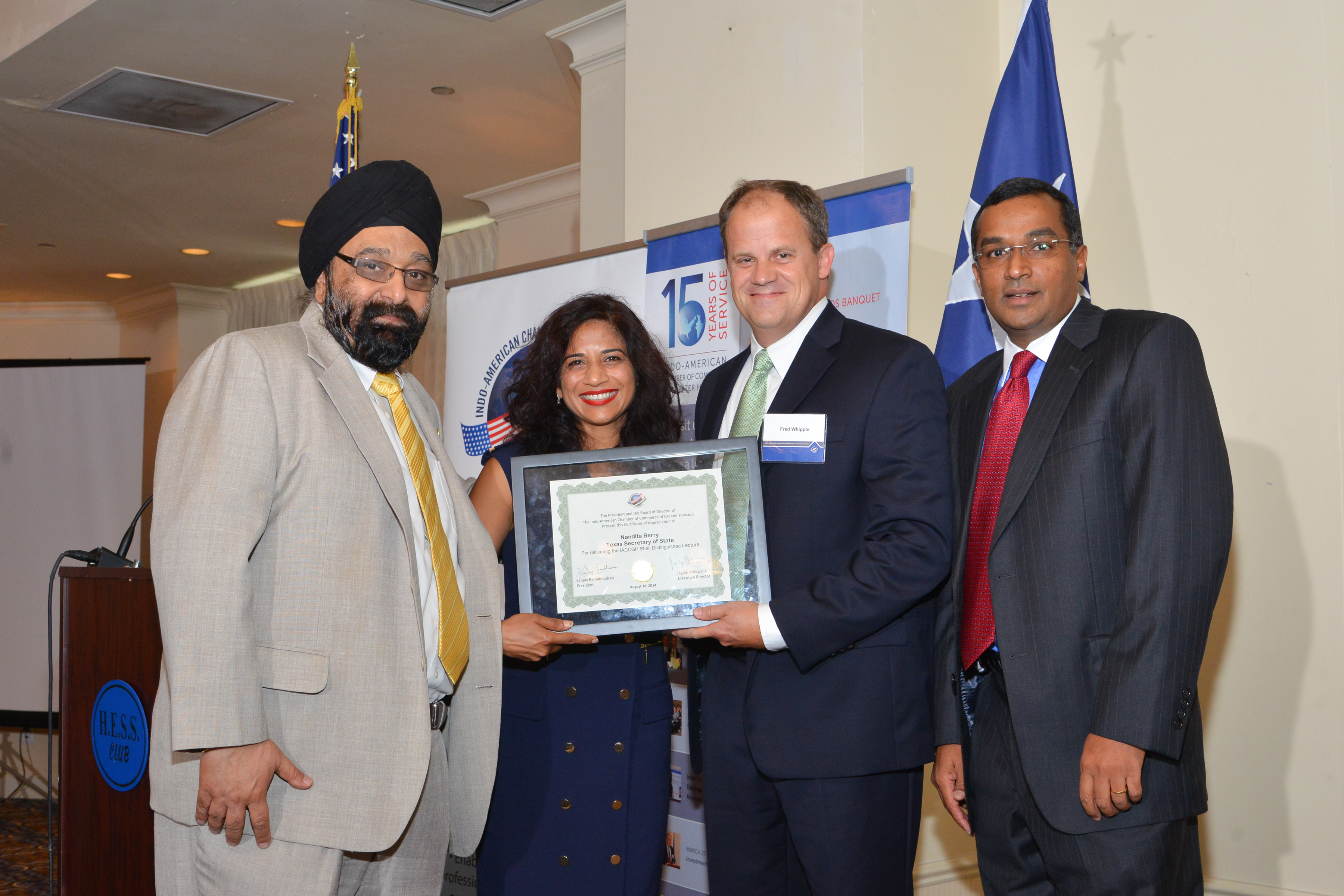 In an eagerly awaited address, Ms. Berry remarked that despite the fact that her name was not Jones, Smith or Austin but Nandita Venkateshwaran Berry, she had the honor of using the same office and sitting at the same desk as did the father of Texas, Stephen F. Austin. According to her, this can happen only in Texas and because of people like Dr. Suresh and Renu Khator, Koshy Thomas, Attorney George Willy, Nat Krishnamurthy as well as the Chamber which “played a vital part in getting to know people and helped inculcate the skills and confidence to go out and look for opportunities.”
