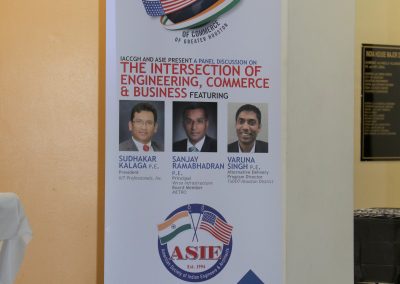 While discussing engineers’ role in politics, the panelists agreed that engineers have a big influence on policies and must take initiative to participate and advise the policy makers to have an impact on the society. When asked about what crucial investments needed to be made for Houston’s infrastructure, both Mr. Singh and Mr. Ram indicated “public transportation” as the most important need while Mr. Kalaga felt “drainage” improvements were critical. The panelists further shared their wisdom when asked to share “one” piece of advice for the audience. Mr. Singh and Mr. Ram, both acknowledged the importance of “communication” while Mr. Kalaga urged the audience to work towards becoming an expert and leader in their chosen path of life. Ms. Sharma opened up the panel to the audience which lead to discussions on varied topics including engineering ethics and life-work balance. Ms. Sharma concluded the panel discussion thanking the guests for the candid conversation.